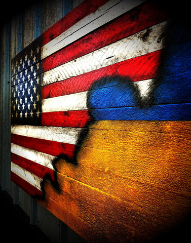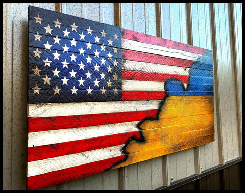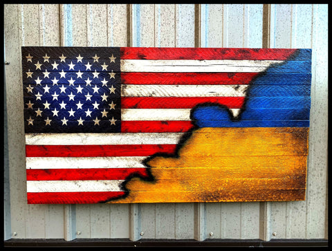 The American/Ukrainian combo flag has a rich and rugged appearance that proudly blends the two flags. The flag is made of 13 individual pieces of wood painted in the traditional red white and blue which gently burns back to the left to reveal the Ukrainian flag on the right. The flag is finished in our special made antique wax that gives it a special grime for a dramatic aged and weathered appearance.